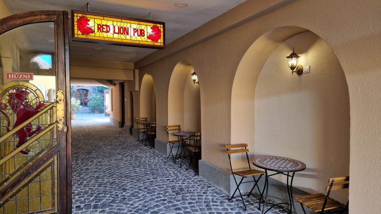 Tradicionális, légkondicionált angol PUB, valódi bőrből készült, egyedi angol bútorokkal, prémium italokkal és snack ételekkel. Belső udvari, macskaköves nyitott és fedett kerthelyiséggel.